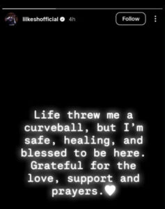 His message read: *“Life threw me a curveball, but I’m safe, healing, and blessed to be here. Grateful for the love, support and prayers.”*