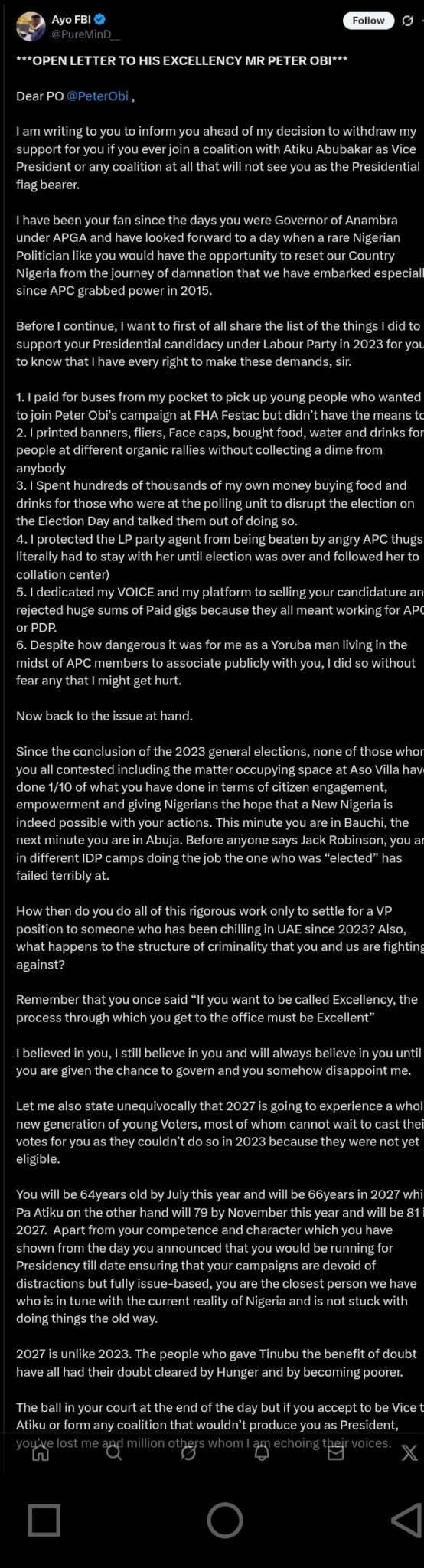 A Nigerian man has written an open letter to Labour Party’s 2023 presidential candidate, Peter Obi, vowing to withdraw his support if Obi joins a coalition with Atiku Abubakar or any alliance that doesn’t present him as the presidential flag bearer in the 2027 election.